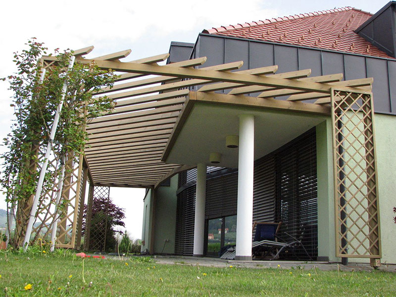 Pergola Ciproš je lahko različnih širin in dolžin. Izdelana je iz kakovostnega masivnega lesa smreke, jelke ali macesna – les je globinsko impregniran, zato bo imela vaša pergola podaljšano življenjsko dobo.